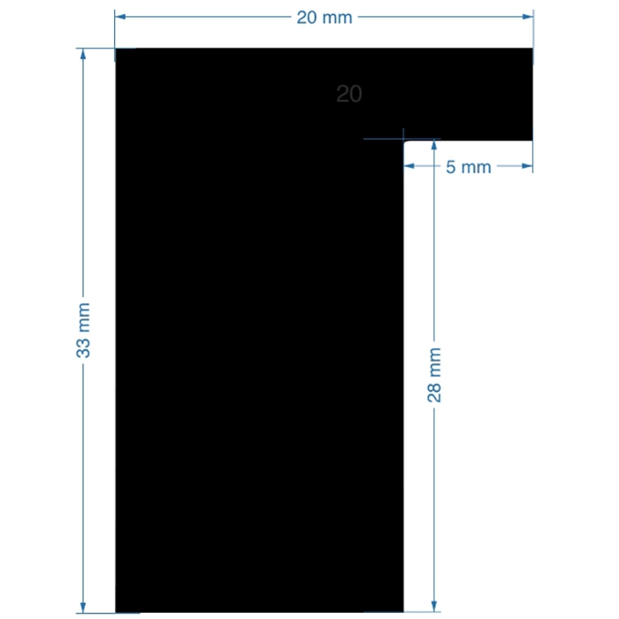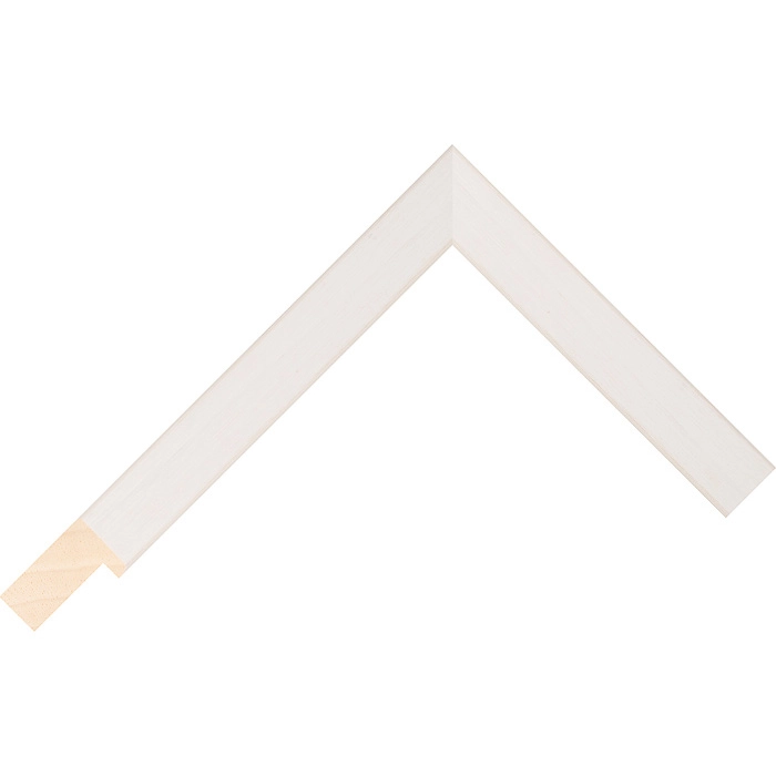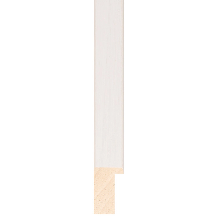 A 20mm wide flat profile, with a total depth of 33mm, that has a white stain finish with the wood grain showing through.