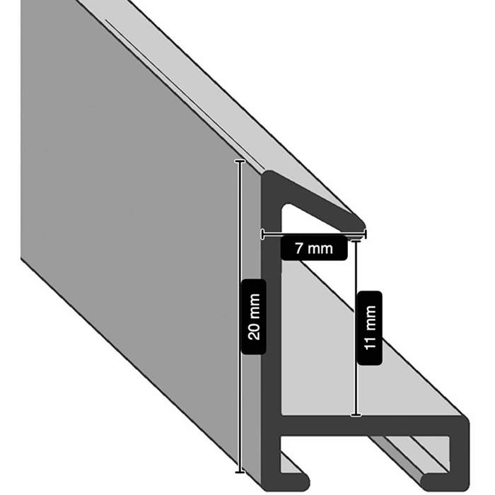 A 7mm wide bevelled profile, with a total depth of 20mm. A smooth matt gold(A) finish on the front face with a brushed gold side(B).