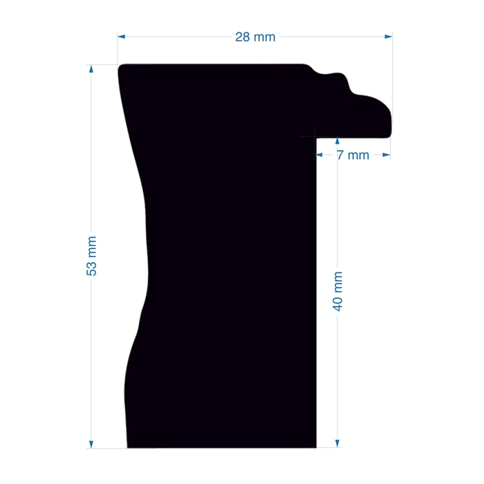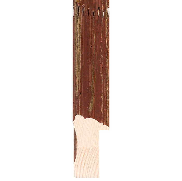 A 28mm wide ridged cushion scoop profile, with a total depth of 53mm. Distressed/worn finish with a predominately red stain.
