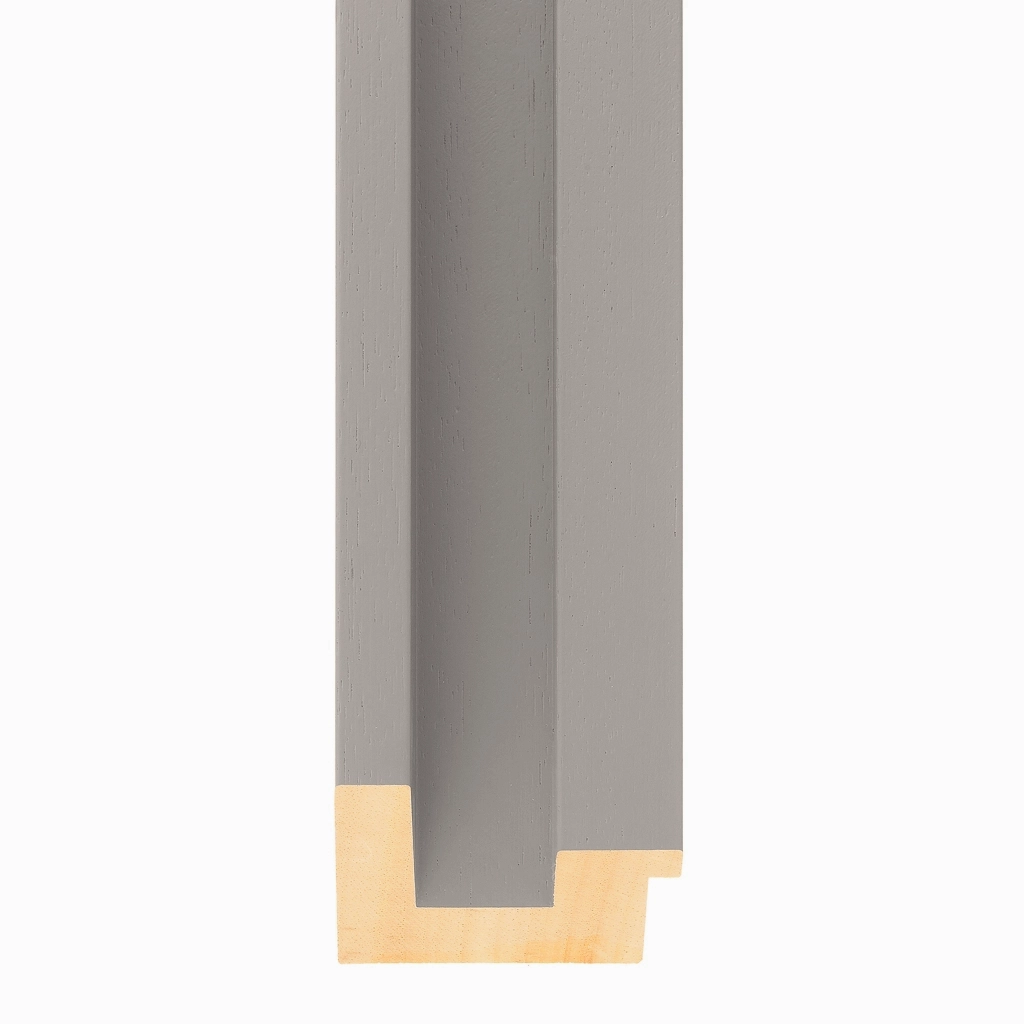 A 73mm wide profile, with a total depth of 39mm, that has a light grey stain finish with the wood grain showing through. This style of moulding is called ‘cassetta’, the term cassetta is Italian and translates to 'little box'. Cassetta frames are characterised by their box-like structure, featuring an inner and outer moulding separated by a flat frieze or band. This design creates a recessed central panel, giving the frame a distinct profile. These frames were commonly used for panel paintings during the Renaissance, emphasising the artwork within a well-defined border.