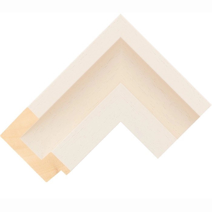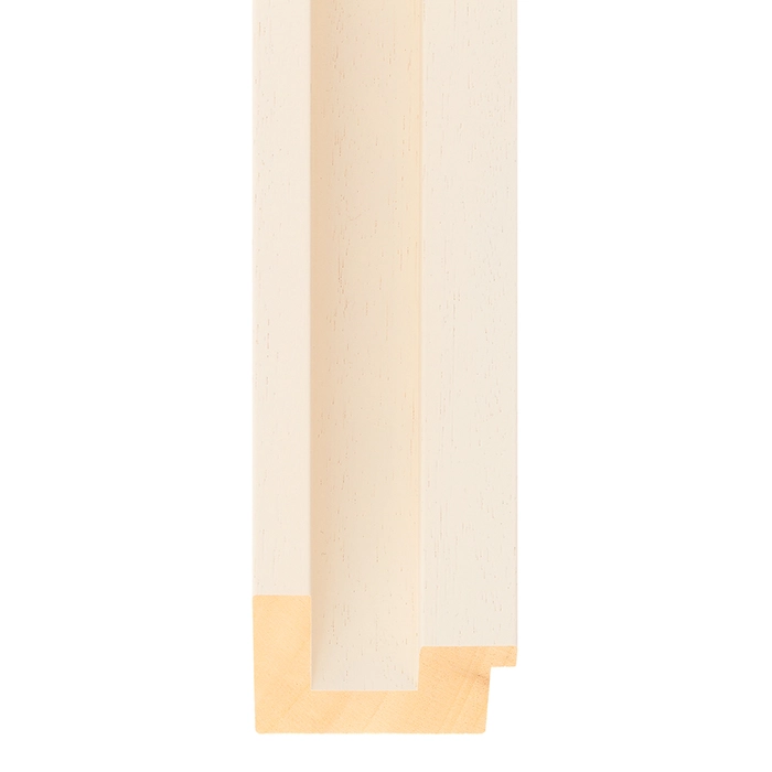 A 73mm wide profile, with a total depth of 39mm, that has a Ivory stain finish with the wood grain showing through. This style of moulding is called ‘cassetta’, the term cassetta is Italian and translates to 'little box'. Cassetta frames are characterised by their box-like structure, featuring an inner and outer moulding separated by a flat frieze or band. This design creates a recessed central panel, giving the frame a distinct profile. These frames were commonly used for panel paintings during the Renaissance, emphasising the artwork within a well-defined border.