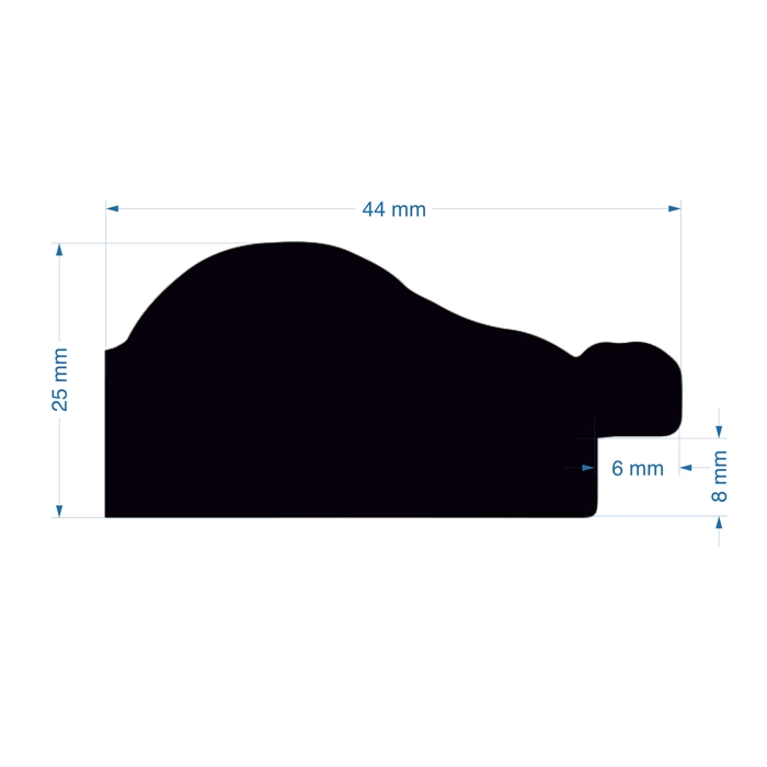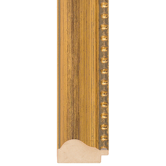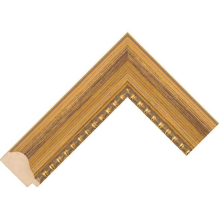 A 44mm wide scoop profile, with a total depth of 25mm. Finished in a gold leaf with a beaded decorative edge.