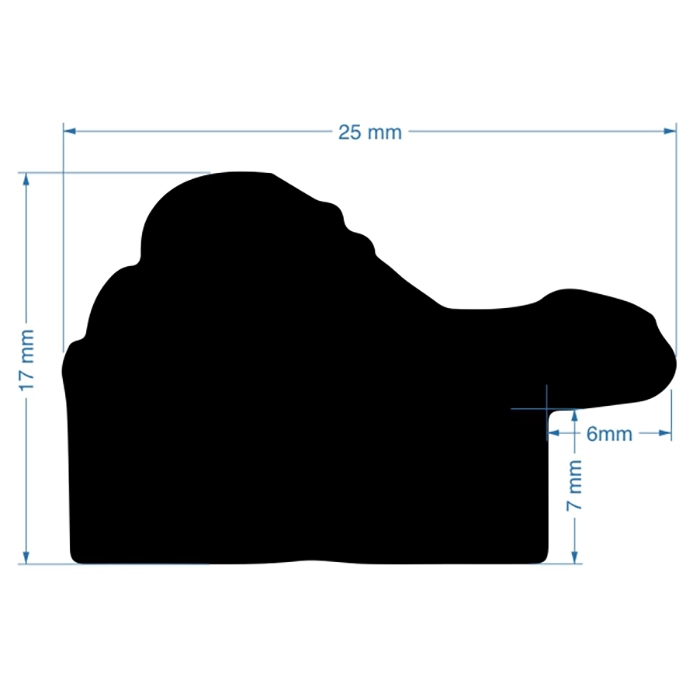 A 25mm wide spoon profile with a total depth of 17mm. Finished in a mahogany stain with a gold sight edge.